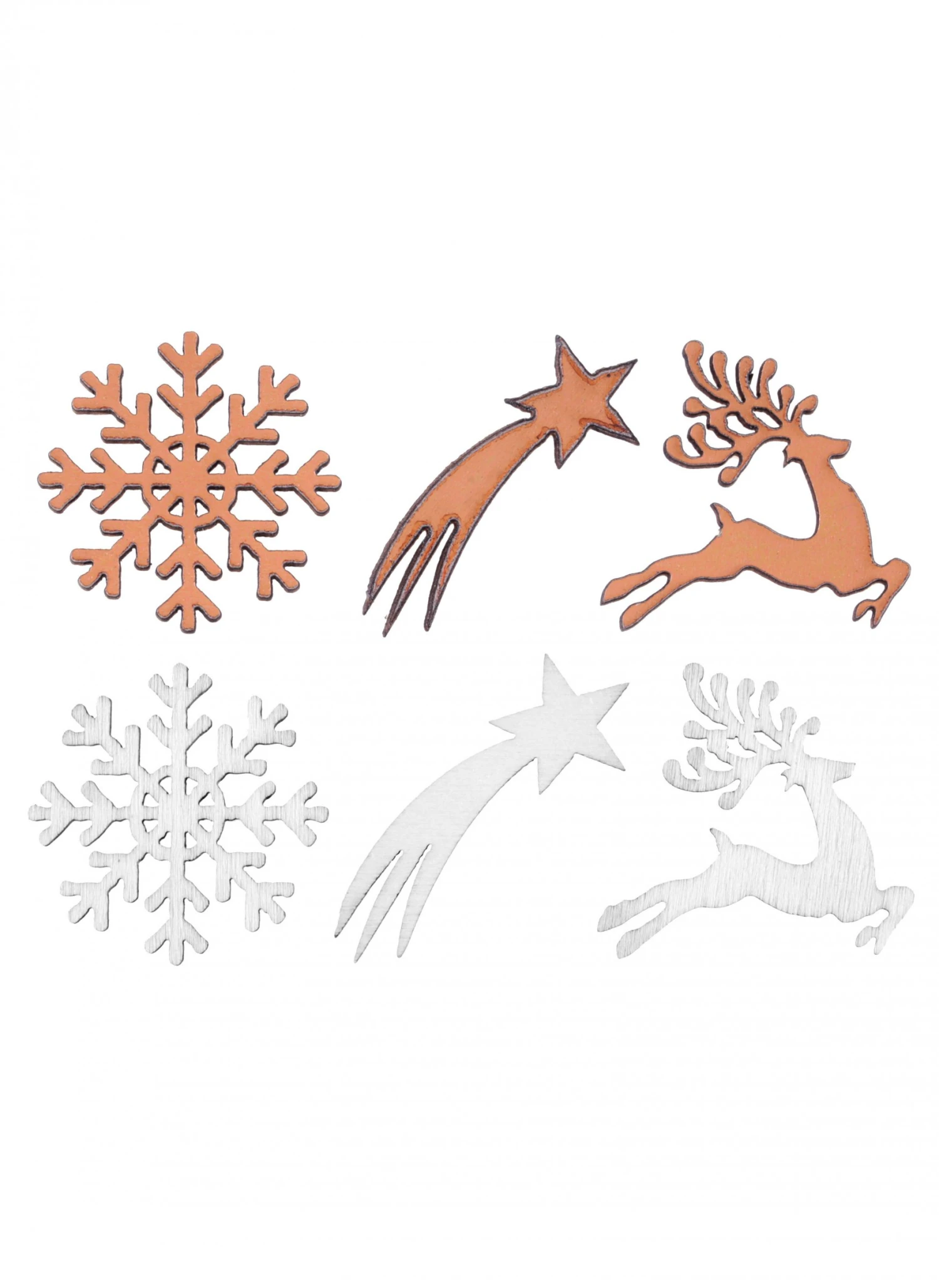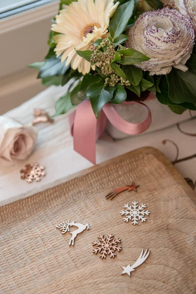 Ils sont de couleur blanche et rose gold. Les confettis sont en bois et représentent des flocons, des étoiles filantes et des cerfs.