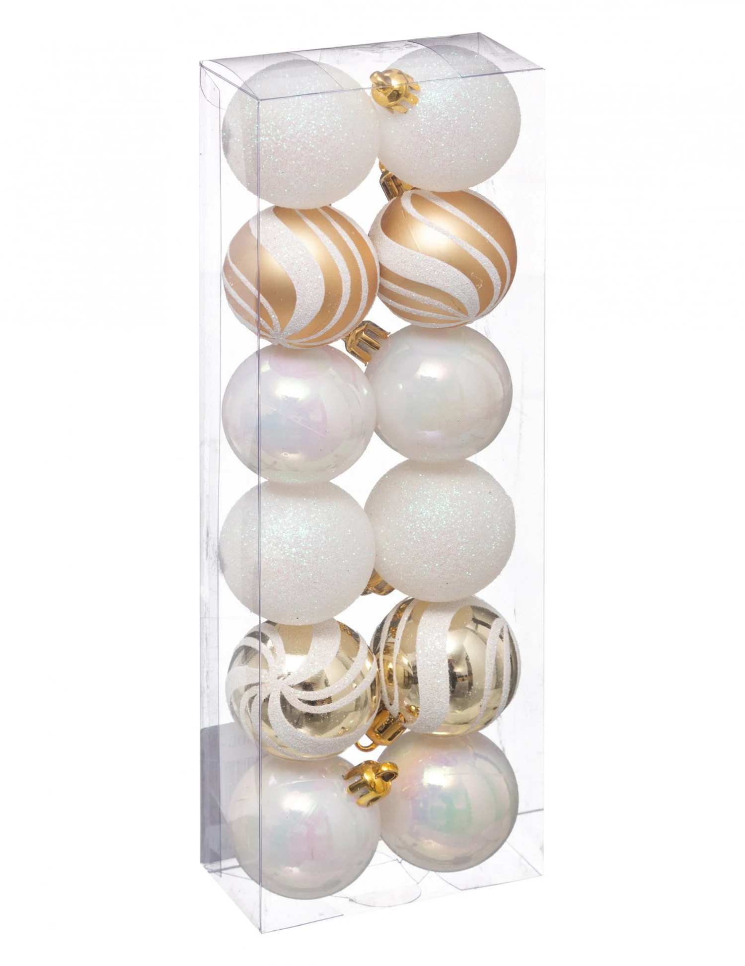 Ce kit contient 12 boules de Noël blanches et dorées.