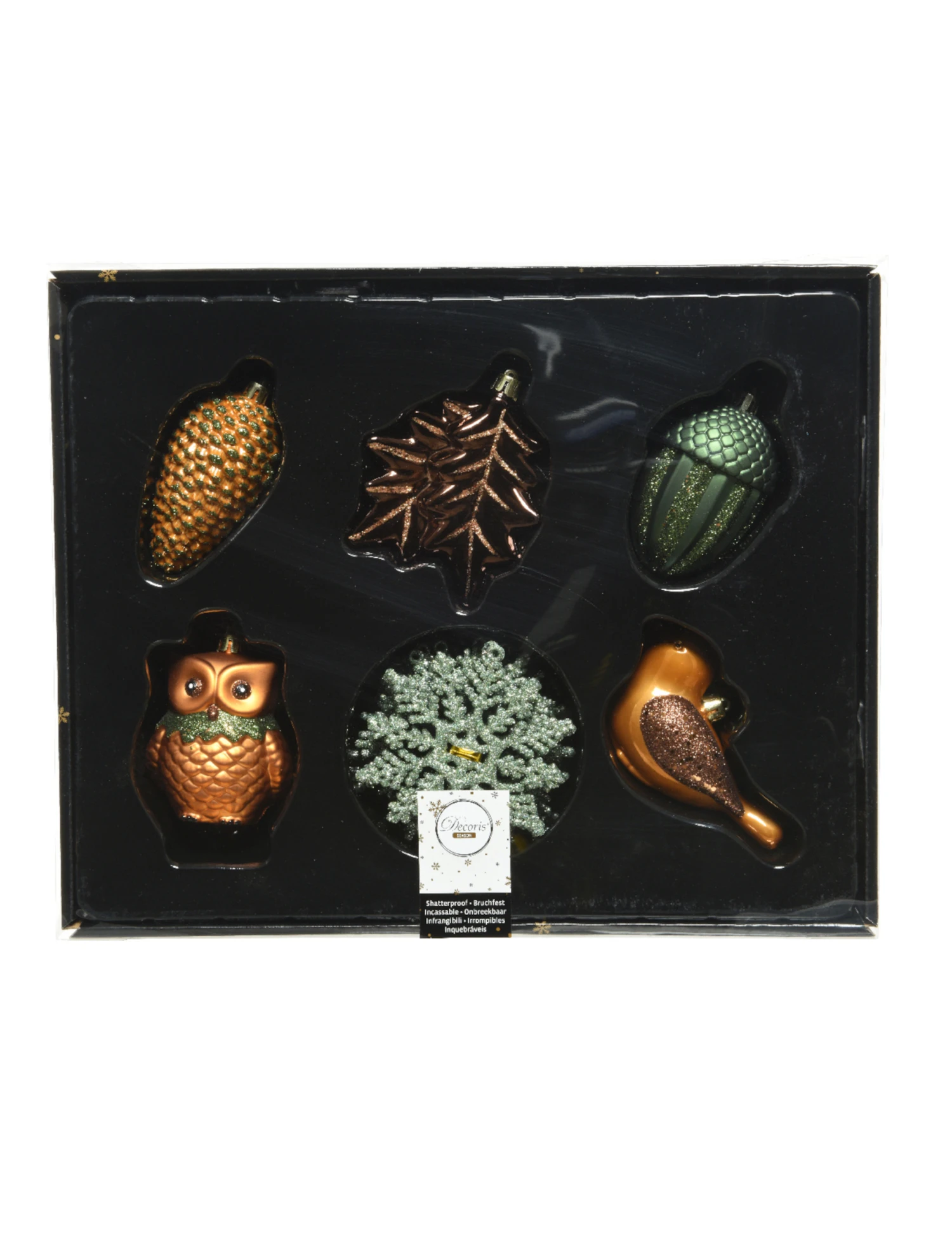 Elles représentent une pomme de pin dorée, une paire de feuilles marron, un gland vert à paillettes, un joli hibou et un oiseau couleur bronze.