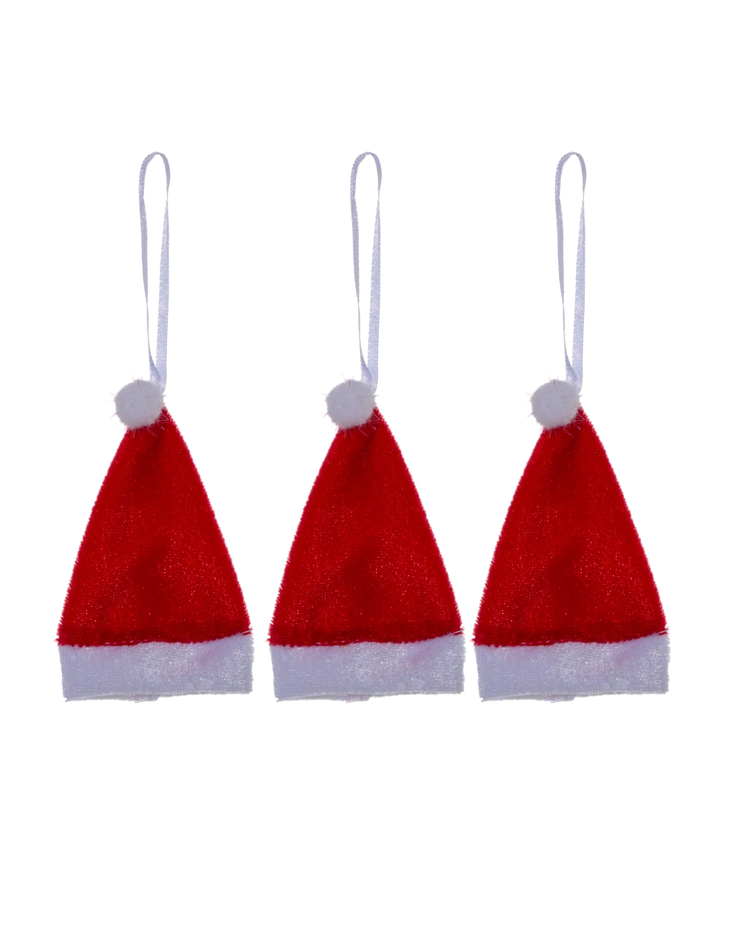 Ces 3 suspensions représentent des bonnets de Noël rouges avec un pompon blanc. Une boucle sur chacun des bonnet permet de les accrocher aisément.