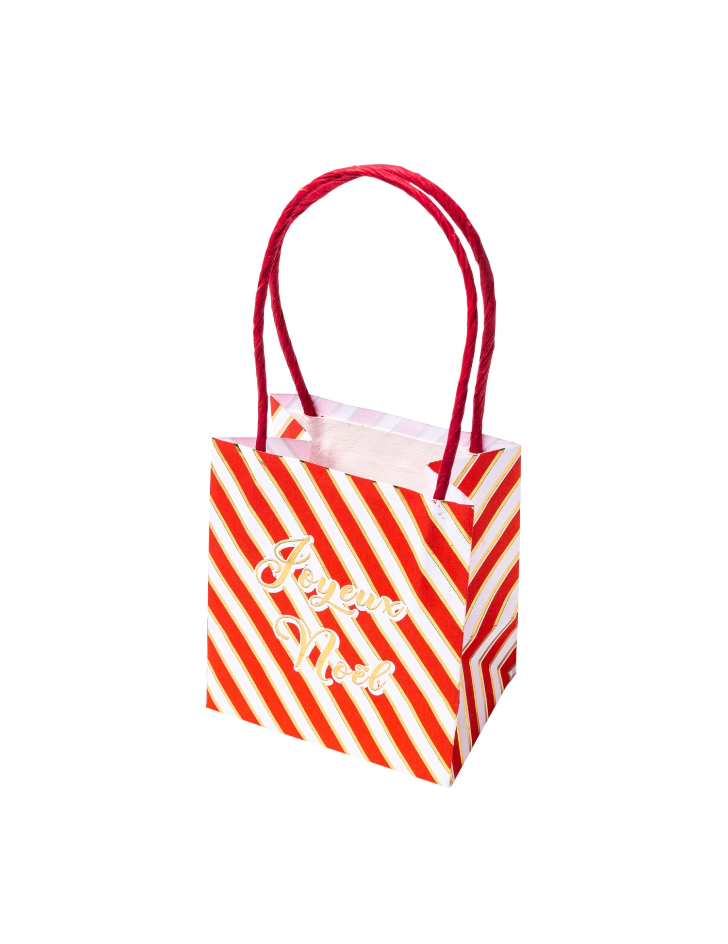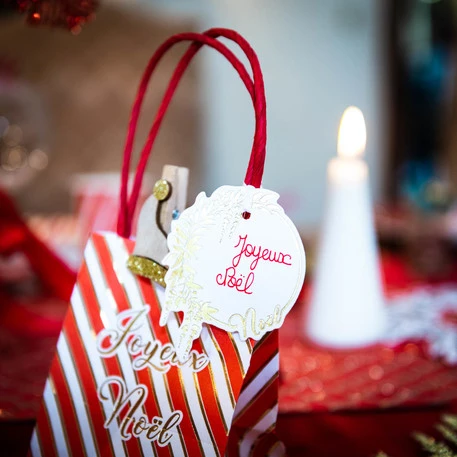 Ils sont rayés de rouge et blanc, et sont décorés de l’inscription « Joyeux Noël » en doré.
