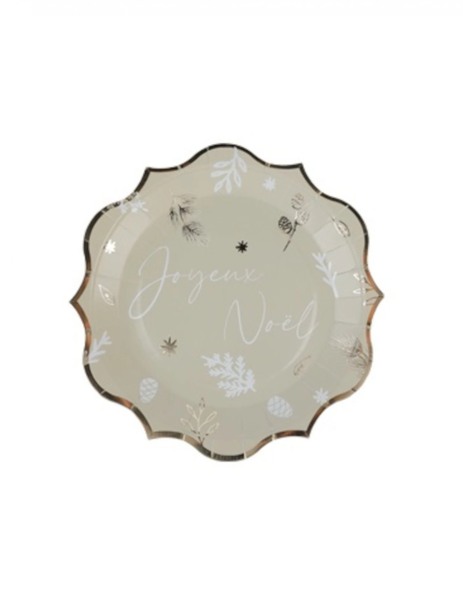 Elles mesurent environ 23 cm. Elles ont une belle couleur vert de gris avec des motifs blancs métallisés comme des feuilles, des branches ainsi que des pomme de pins. Au centre vous trouverez l’inscription « Joyeux Noël » en lettres blanches métallisées. Les bords des assiettes sont ciselés avec un contour doré.