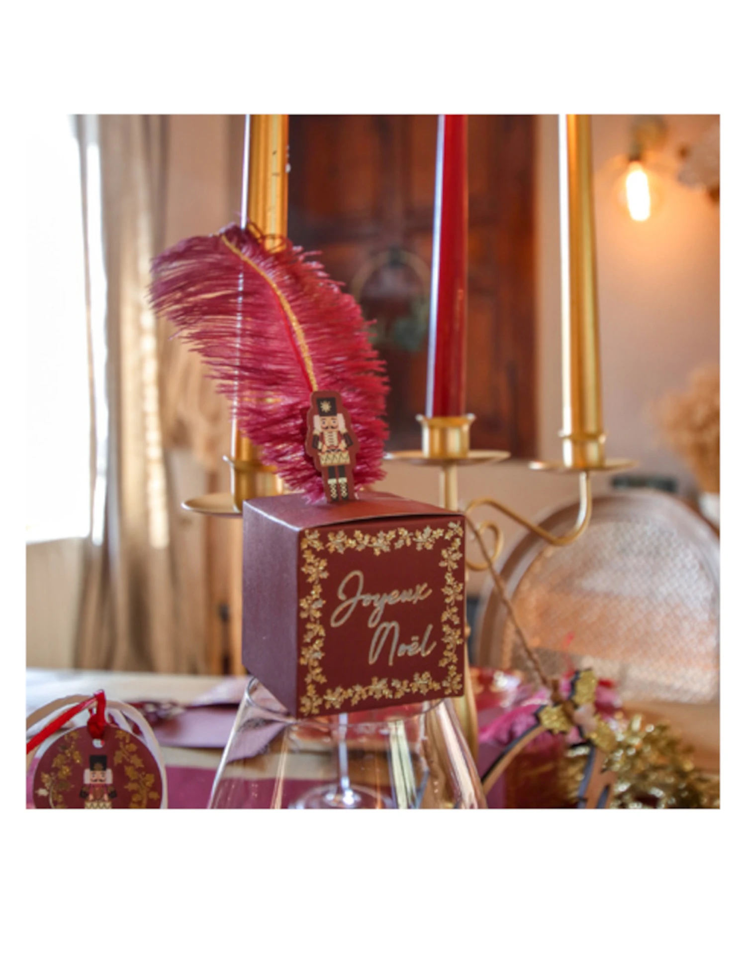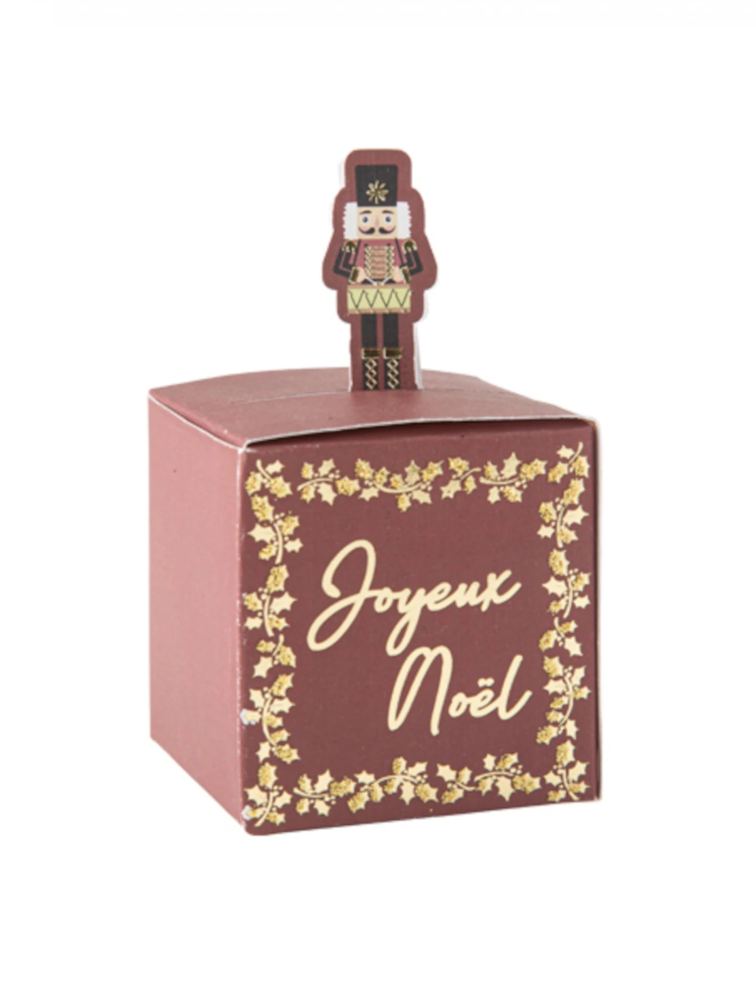 Chaque petite boîte mesure environ 6 cm. Sur un fond bordeaux, ces boîtes de forme carré, contiennent un soldat du célèbre conte des Casse-Noisettes. Vous trouverez également des motifs dorés en forme de guirlande ainsi que l’incription « Joyeux Noël« .