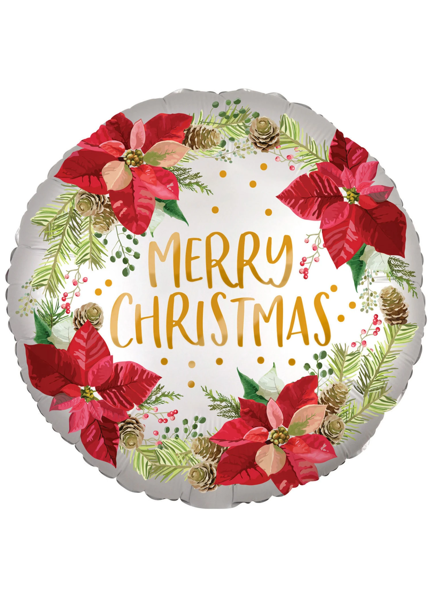 Tout autour est illustrée une couronne de fleurs de poinsettia avec des branches de sapin et des pommes de pin.