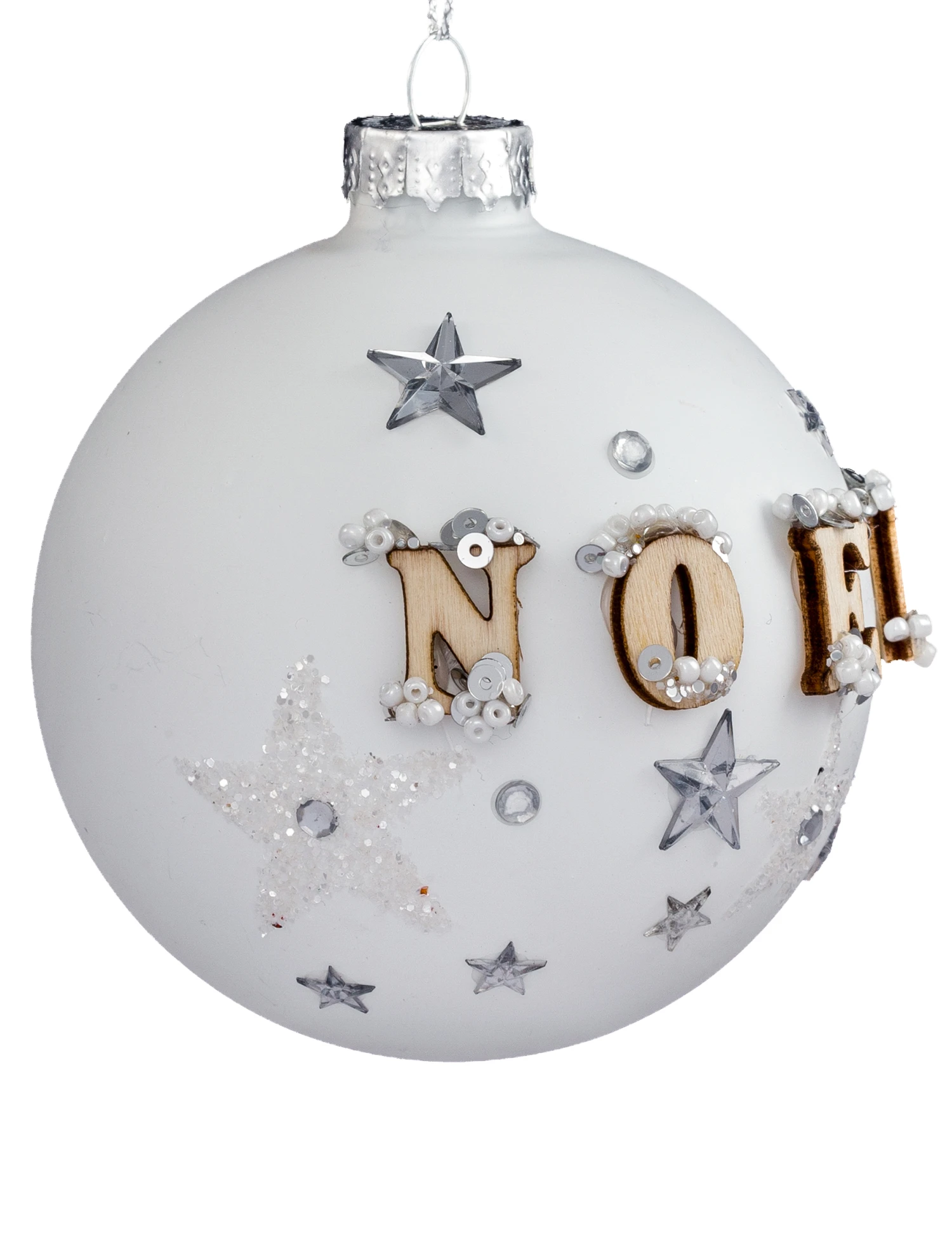 De couleur blanche, elle est décorée de strass et d’étoiles argentées et comporte le mot « Noël » en bois.