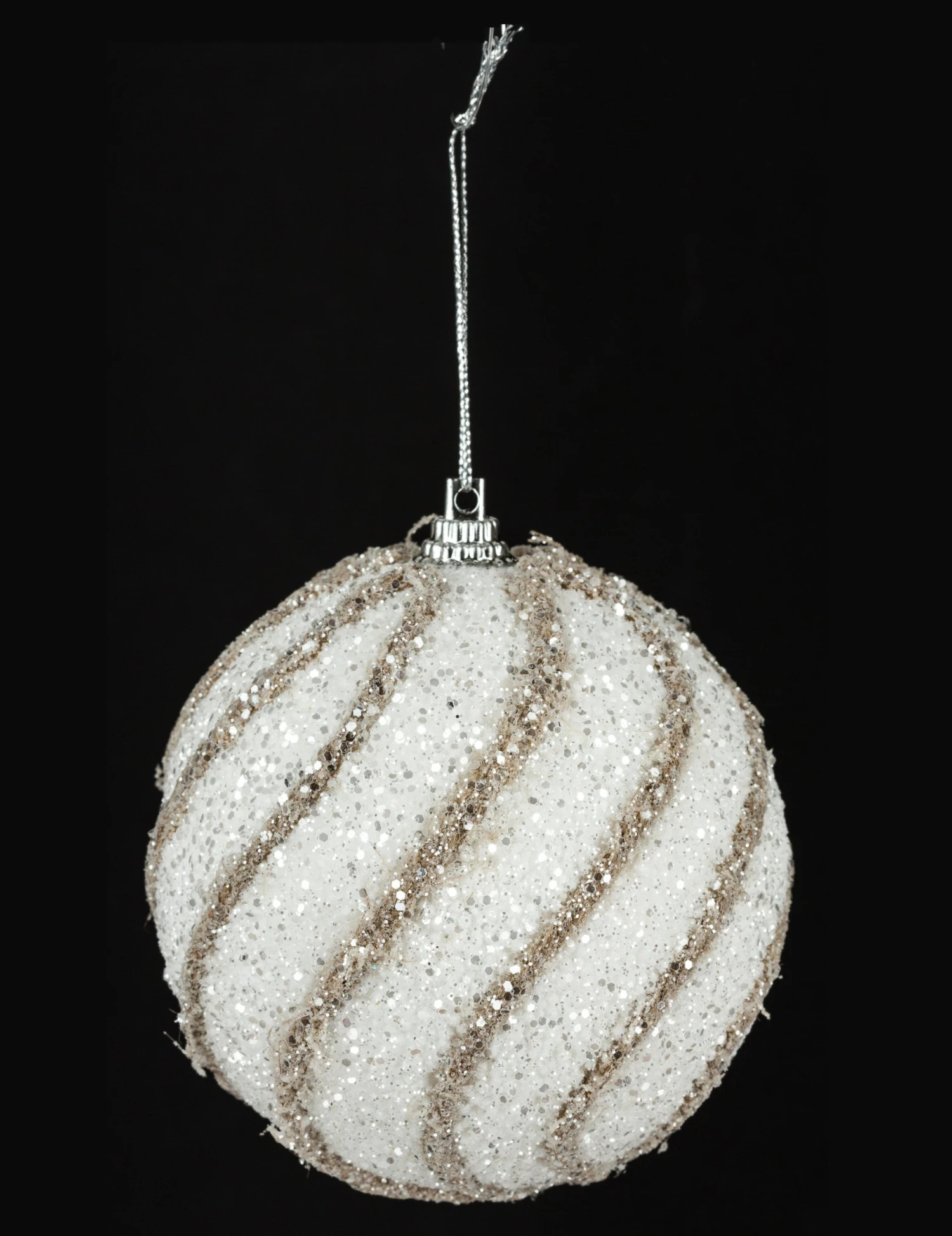 Elle est décorée de paillettes et de rayures en spirale de couleur blanche et dorée.