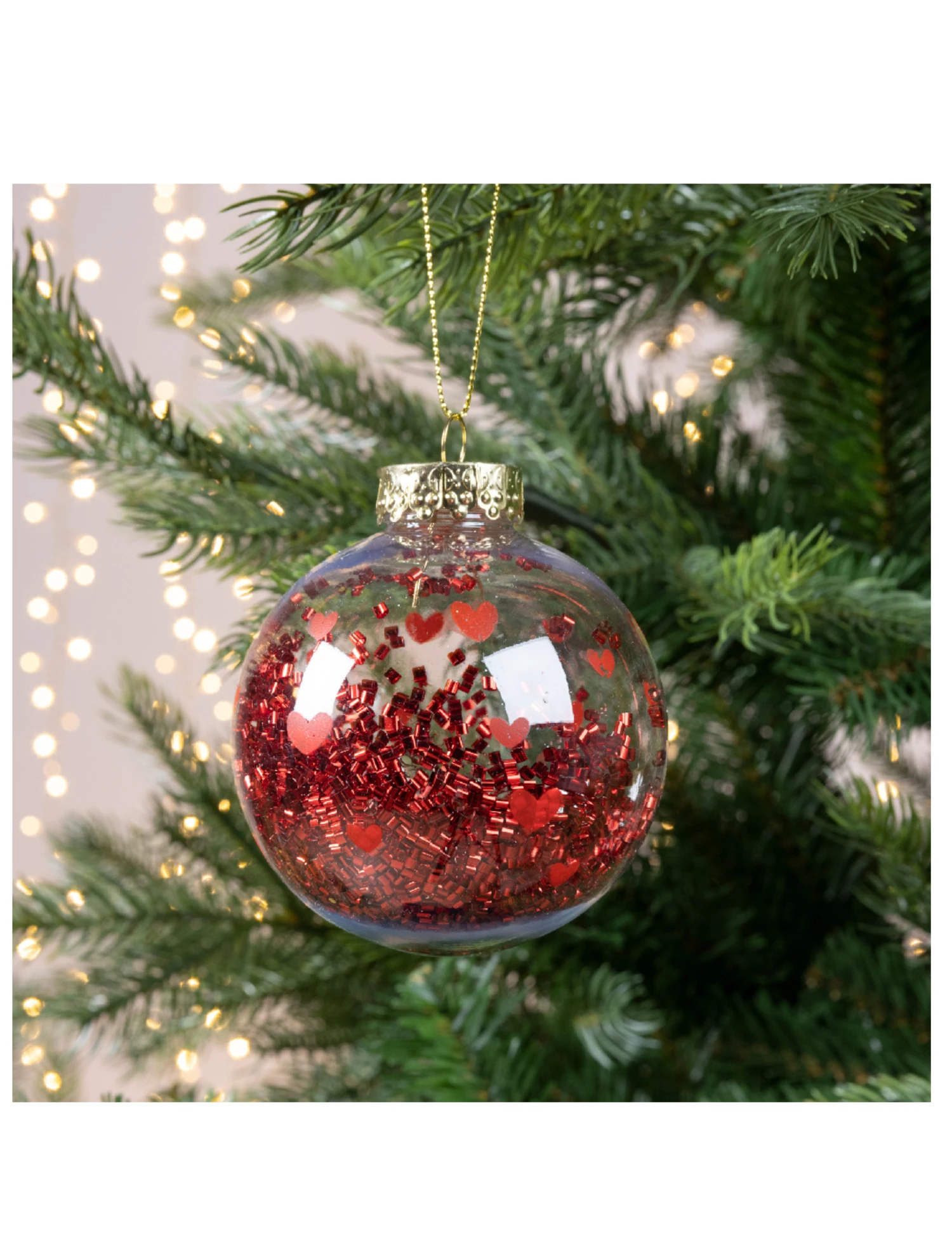 Cette boule de Noël en plastique transparent est décorée de petits coeurs rouges.