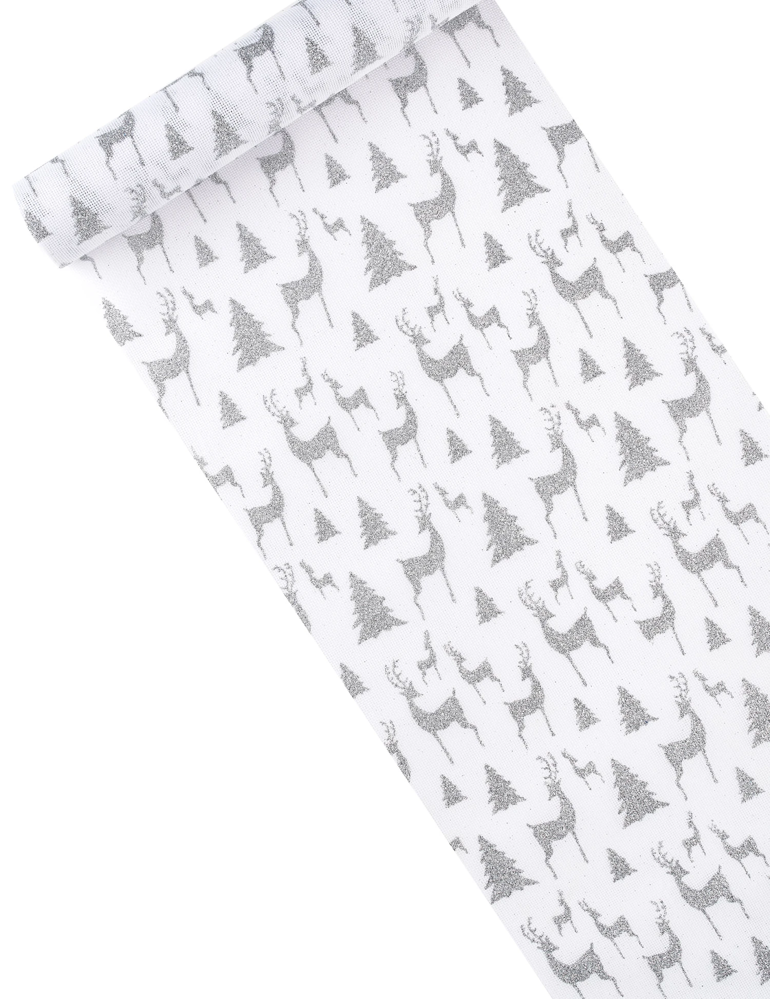 Ce chemin de table de Noël est en tissu blanc imprimé de rennes et de sapins de Noël à paillettes argentées.