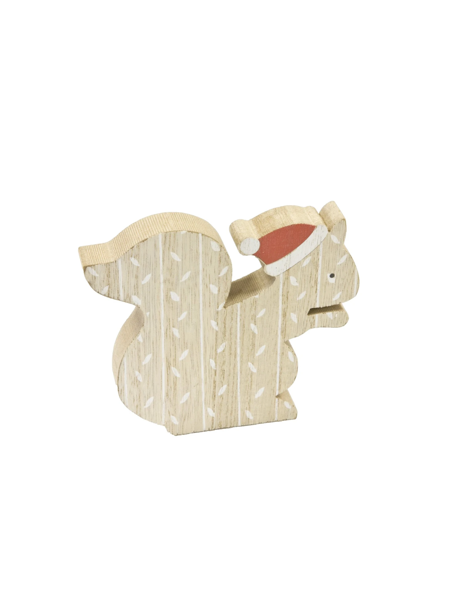 Elle représente un petit écureuil de couleur naturelle avec des motifs blancs, portant un bonnet de Noël.
