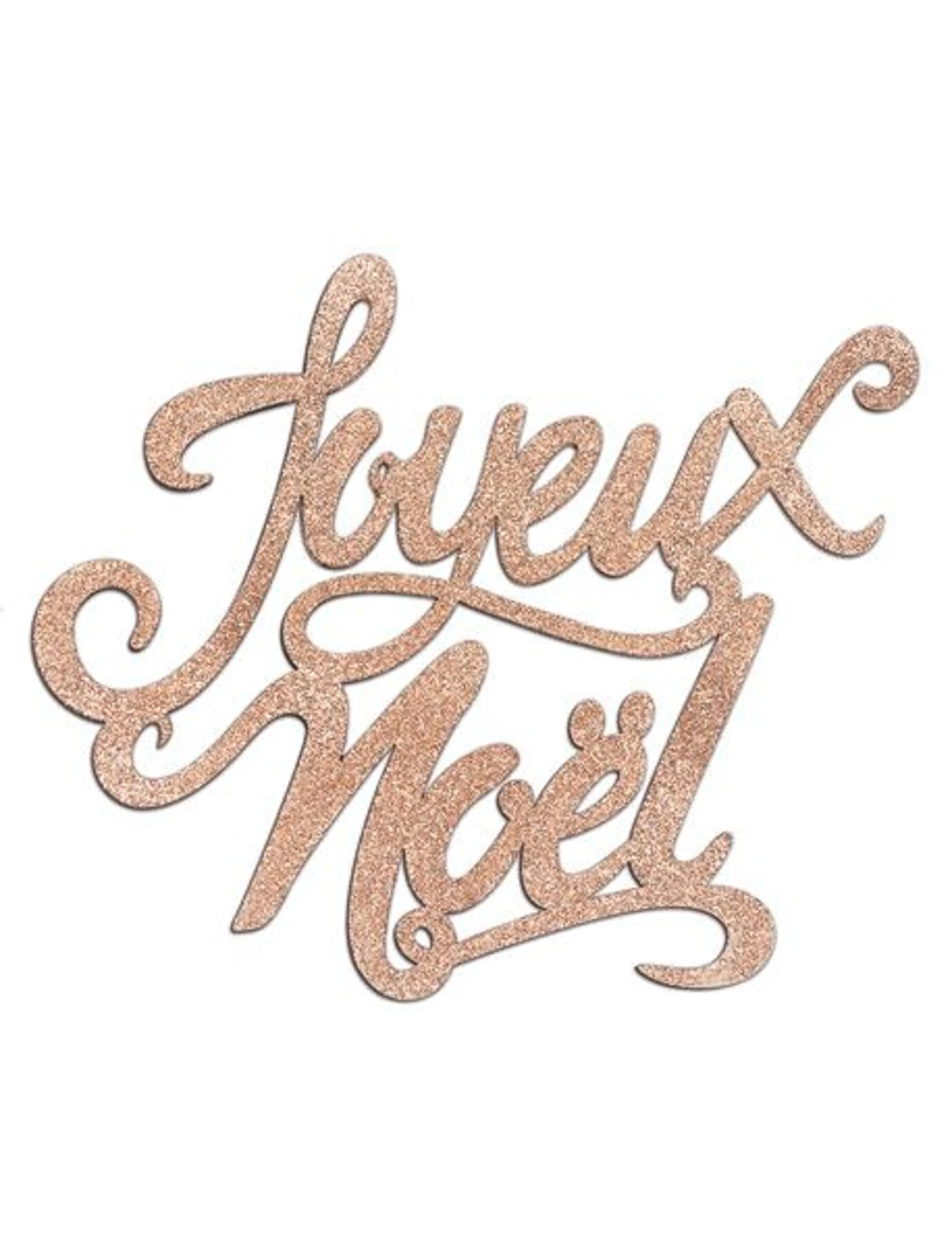Elle forme les mots « Joyeux Noël » avec des pailletes couleur cuivre.