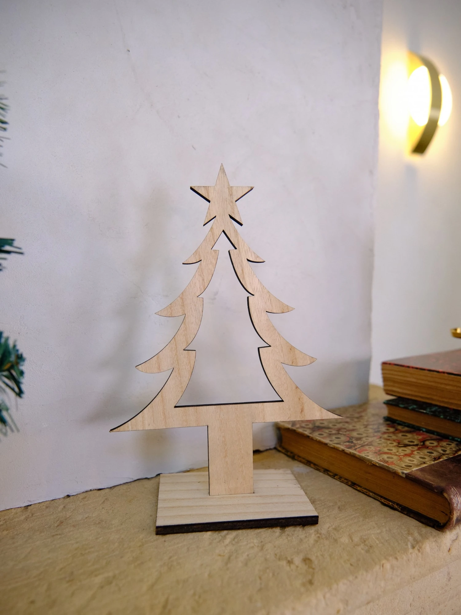 Cette décoration de Noël représente un sapin en bois naturel.