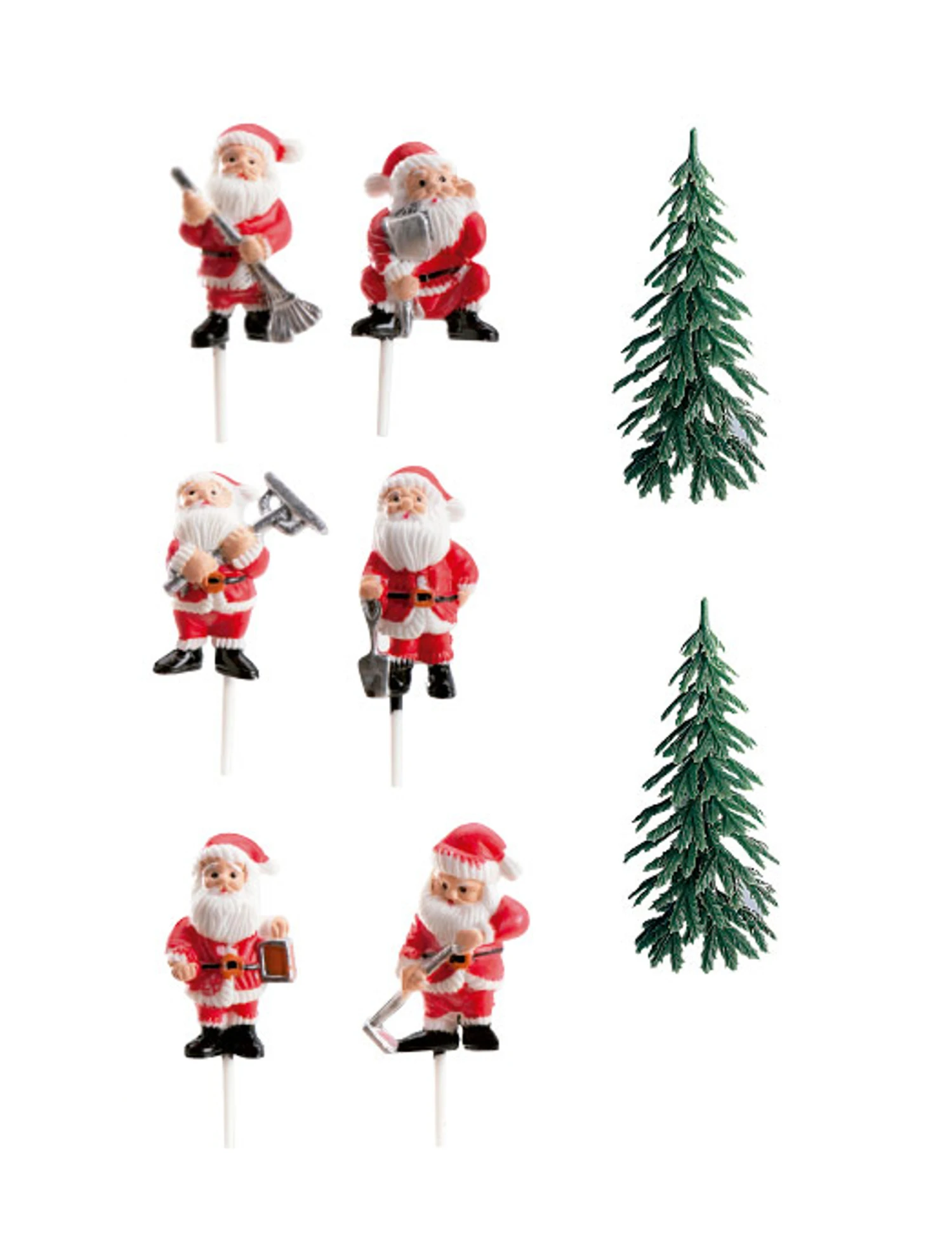 Ce kit de décorations de bûche de Noël se compose de petits pères Noël et de sapins verts. Chaque décoration possède un petit pic en plastique pour pouvoir la poser facilement sur votre dessert et de permettre une bonne stabilité.