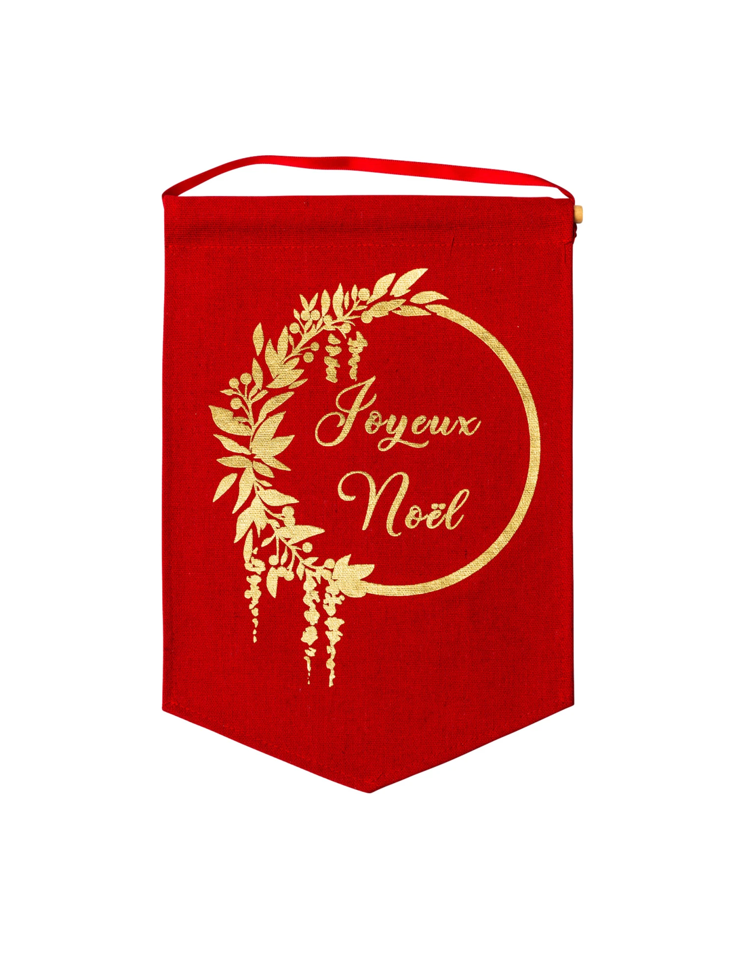 Elle est en lin de couleur rouge et est ornée de l’inscription « Joyeux Noël » au centre d’une couronne végétale dorée.