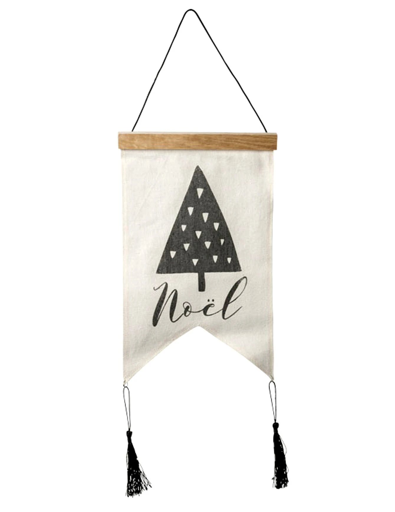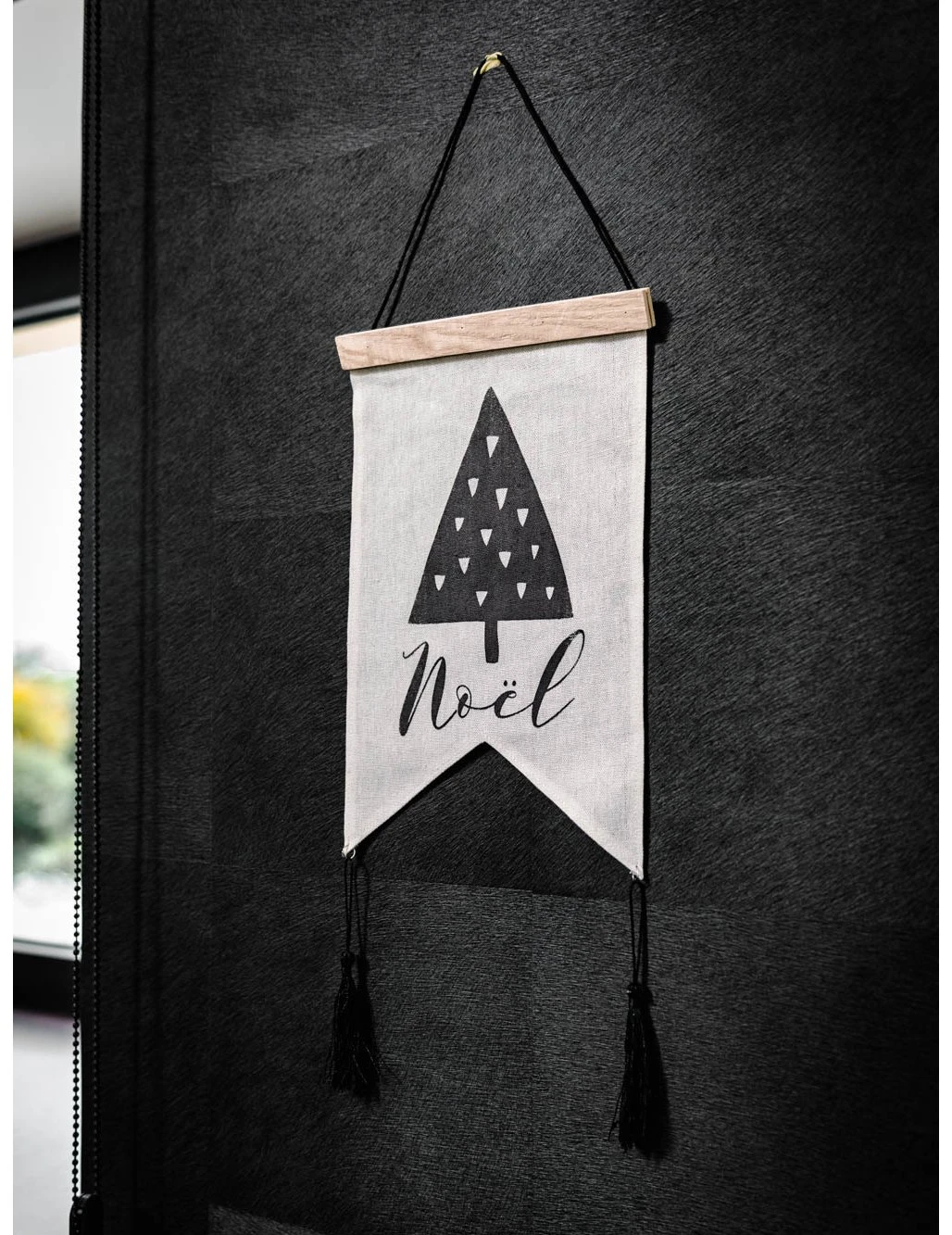 Cette tenture est en lin blanc avec un sapin grapique et l’inscription « Noël » en jolies lettres noires.